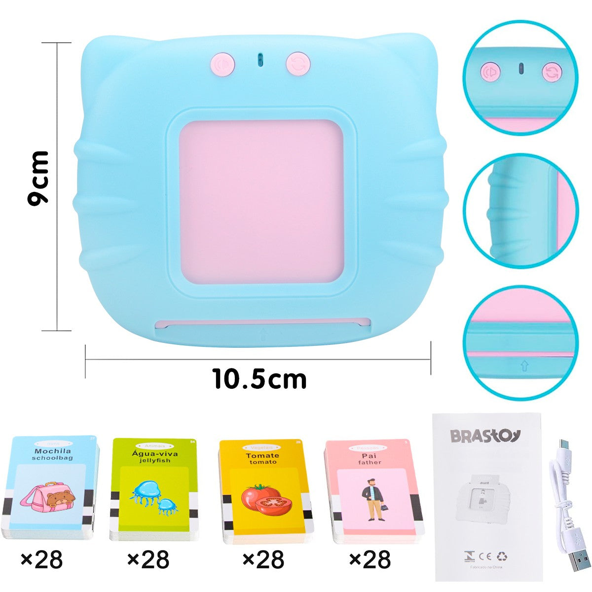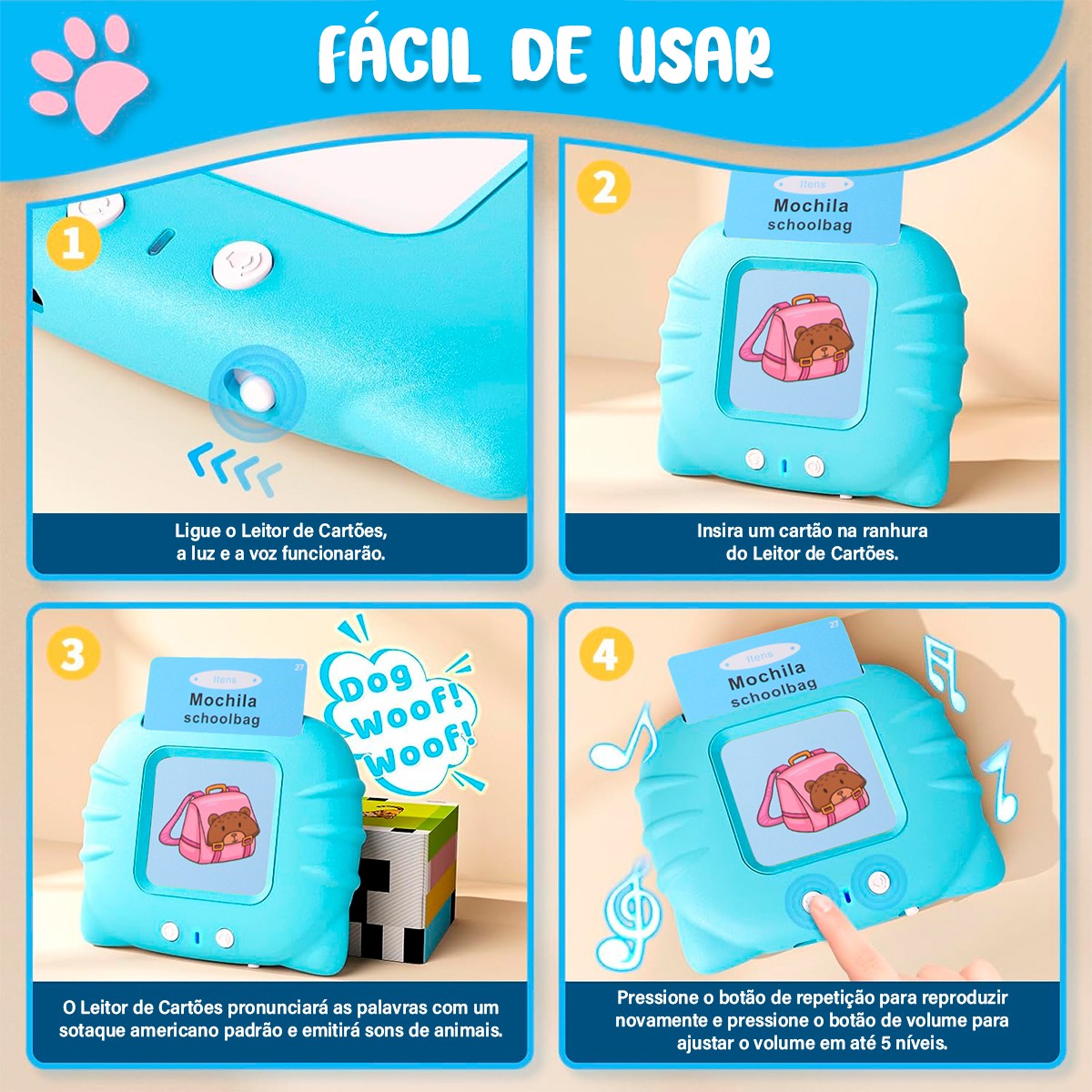 Ao inserir um cartão, o gatinho inteligente reconhece o código e dita a palavra com a pronúncia perfeita em ambos os idiomas. É o método Montessori aplicado à tecnologia: a criança vê a imagem, lê a palavra em português e inglês e ouve o som correspondente imediatamente.